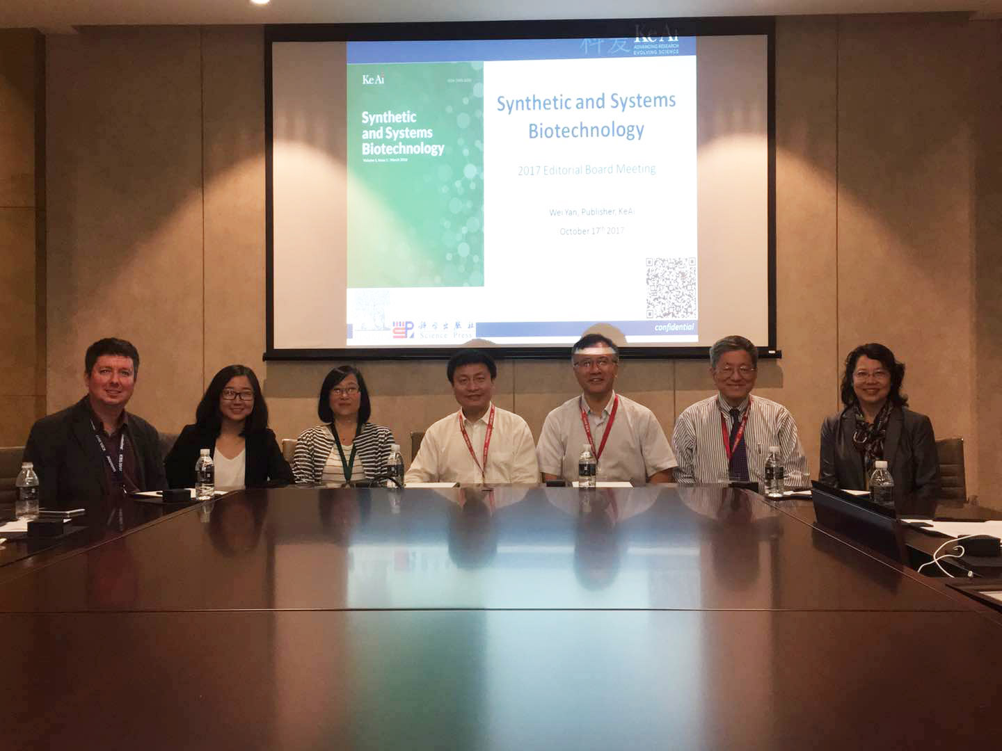 Synthetic and Systems Biotechnology recently held its 3rd Editorial Board meeting. On the 17th of October, 2017 the journal’s editorial leadership and the publisher met in Shanghai, China, during the “6th Official Conference of the International Chemical Biology Society”. Building on the journal’s strong performance in its early years as well as the latest achievements, such as its PubMed Central indexing, the team collaboratively set course for taking the journal to the next level. The publisher would like to thank the Editorial Board for its continued commitment and all the authors and reviewers who have contributed to Synthetic and Systems Biotechnology, making it the high quality Open Access journal it is today.
