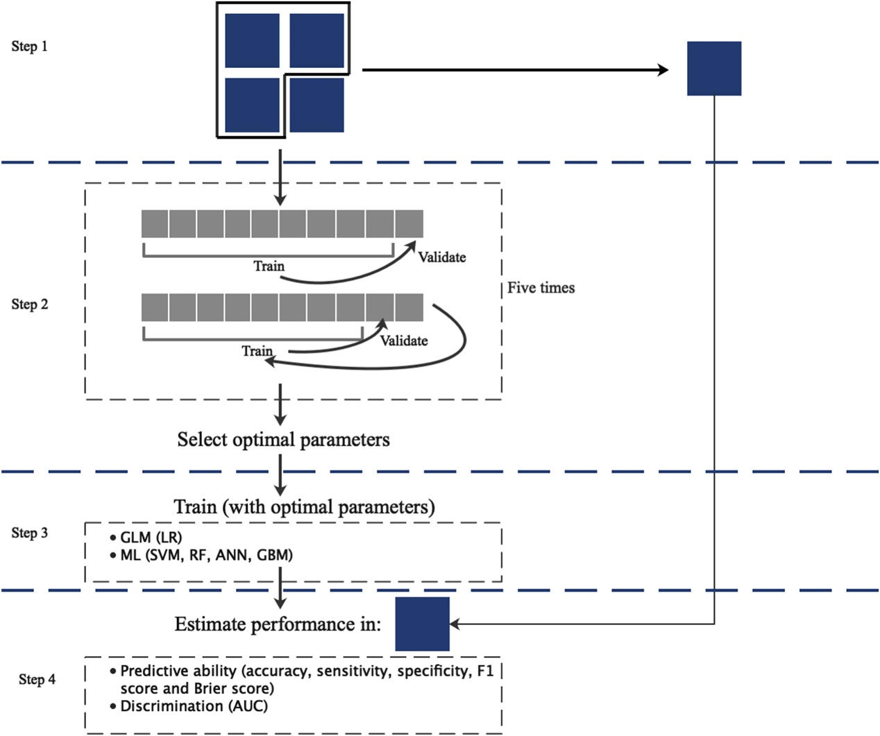 Fig: Overview of the experimental setup. Step 1 was selecting the training cohort (n = 184) and the internal validation cohort (n = 62) by random seeds. Step 2 was selecting the optimal parameters through five times ten-fold cross-validation. Step 3 was the training of the final model with optimal parameters on the entire training data by the LR and ML. Step 4 was validating the models of step 3 with the predictive ability and discrimination. GLM, Generalized linear model; LR, Logistic regression; ML, Machine learning; SVM, Support vector machines; RF, Random forests; ANN, Artificial neural networks; GBM, Gradient boosting machines; AUC, Areas under the receiver-operator characteristic curve.