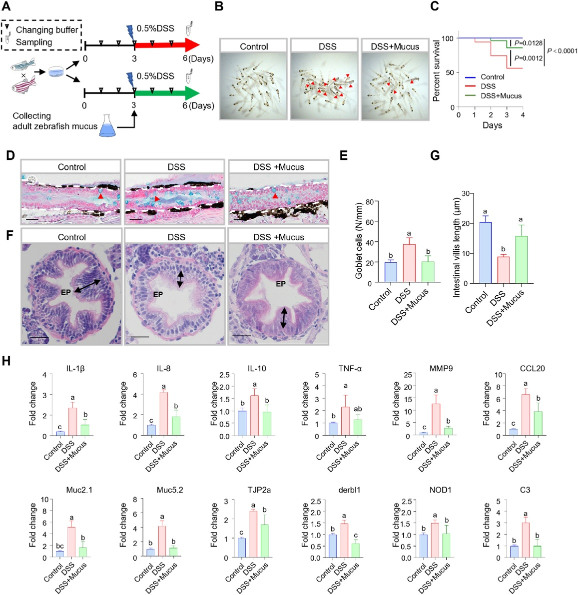 Image:Adult zebrafish mucus plays a protective role in DSS-induced inflammation. (A) Experimental scheme to evaluate the effects of adult zebrafish mucus on larvae induced by DSS. The control group did not receive any treatment. (B) Representative images of the larvae at 6 Day in control, DSS-induced, and mucus-treated group. ▲ indicates dead larvae. (C) Cumulative survival rate of three groups (n = 40). (D) AB staining of the gut from control, DSS, and mucus treatment fish. Scale bar: 50 μm. (E) The number of goblet cells of gut tissues from three groups (n = 6). (F) H&E staining of the gut from control, DSS, and mucus treatment fish. EP, epithelium; The black arrow represents the length of the intestinal villi. Scale bar, 20 μm. (G) The length of gut villus in control, DSS, and mucus groups (n = 6). (H) Histogram illustrates results from qRT-PCR of transcripts for selected inflammatory factors of DSS-induced, mucus-treated and control zebrafish larvae (n = 6).