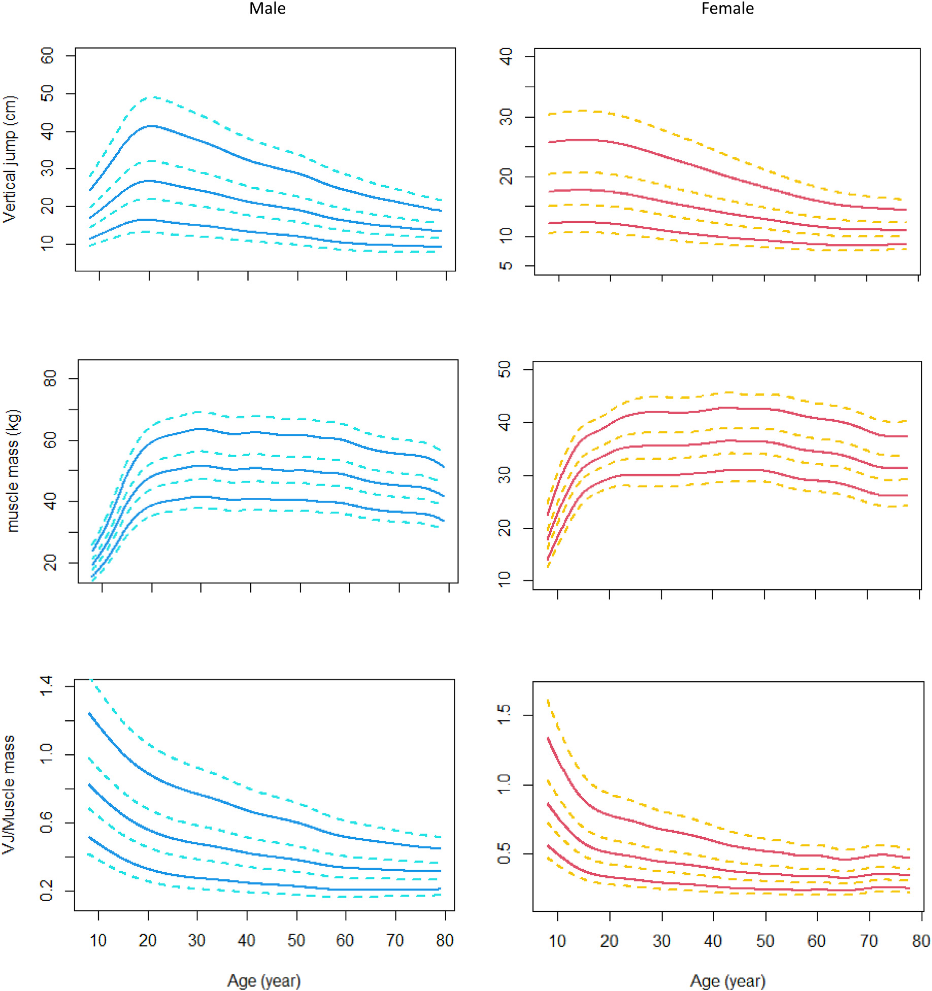 The interdisciplinary research team found that in males, VJ values exhibited an upward trajectory, reaching a peak at around the age of 18, with the 5th and 95th percentile values being 17.7 cm and 41.3 cm, respectively. Subsequently, following this peak, VJ values gradually declined with increasing age. In females, VJ values remained relatively stable from childhood to early adulthood and then declined after the age of 30. The peak values of SR were observed in early adulthood for both sexes, remaining stable in females but declining with age in males.