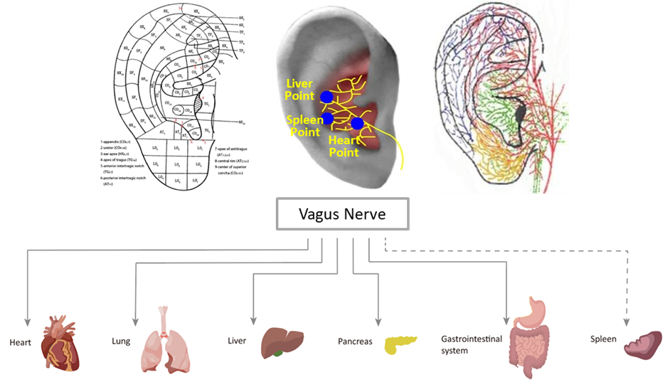 TaVNS has shown significant effects in various body systems. It has effective in reducing depression scores and treating conditions such as migraines, anxiety, cognitive disorders, Parkinson’s disease, and cognitive decline. Additionally, it has demonstrated benefits for the cardiovascular system by lowering blood pressure and heart rate, treating arrhythmias and myocardial infarction, and alleviating cardiac insufficiency and heart failure. Furthermore, it has proven effective for treating functional gastrointestinal diseases, glucose-lipid metabolism disorders, endotoxemia, rheumatoid arthritis, systemic lupus erythematosus, as well as comorbid chronic diseases with depression.