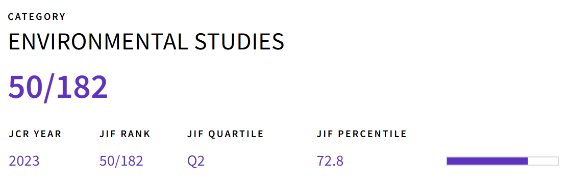 This advancement has propelled the Chinese Journal of Population, Resources and Environment into the second quartile (Q2) of its category. Specifically, the journal now ranks 50th out of 182 journals in the Environmental Studies category, with a JIF percentile of 72.8%. This marks a significant milestone in our journey toward academic excellence and reflects the high-quality research and impactful studies we have been privileged to publish.