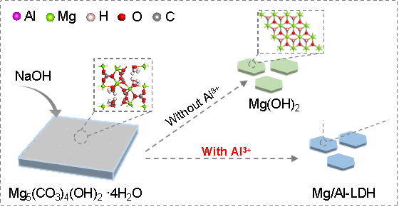 Image: The schematic representation of the conversion to Mg/Al-LDH from Mg5(CO3)4(OH)2·4H2O. Credit: Luming Peng.