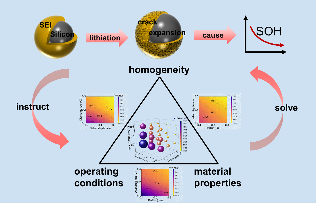 The team quantitatively analyzed the effects of three factors on SEI stability and battery capacity utilization by building a model of individual electrode particles. They found out that in order to improve SEI stability, spherical silicons with smaller particle sizes should be used as much as possible in the design of electrode materials. In terms of SEI geometry, it is particularly important to artificially construct SEI with a uniform structure, while when it comes to cell operation, high multiplicity will bring greater capacity utilization but is not conducive to SEI stability.