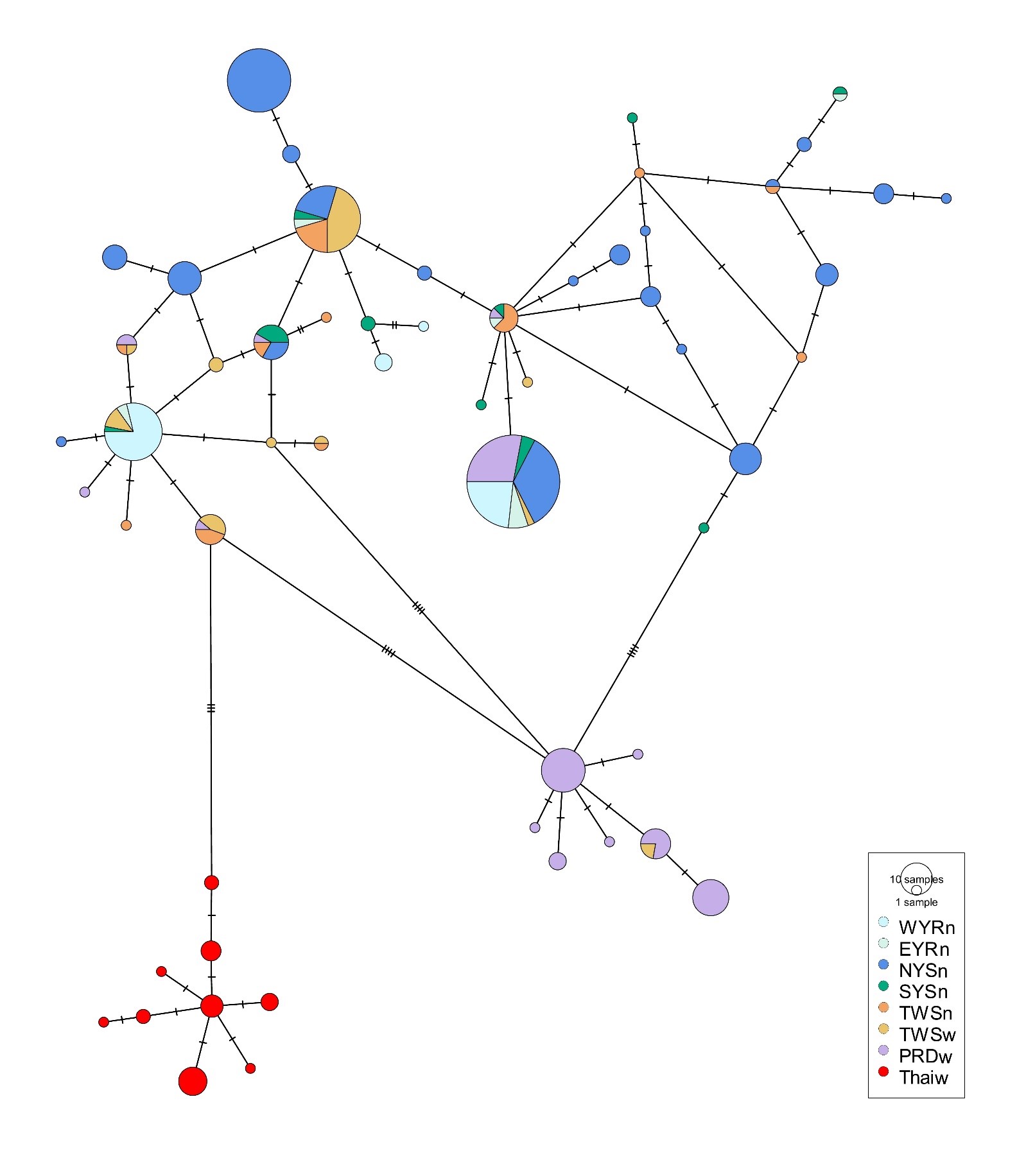 The minimum spanning network of the mtDNA control region found shared haplotypes among finless porpoises in Chinese waters, but those from the Gulf of Thailand formed a unique matriline lineage. The genetic differentiation, or divergence, within the South China Sea also appears to be higher than that of most finless porpoise populations examined to date.