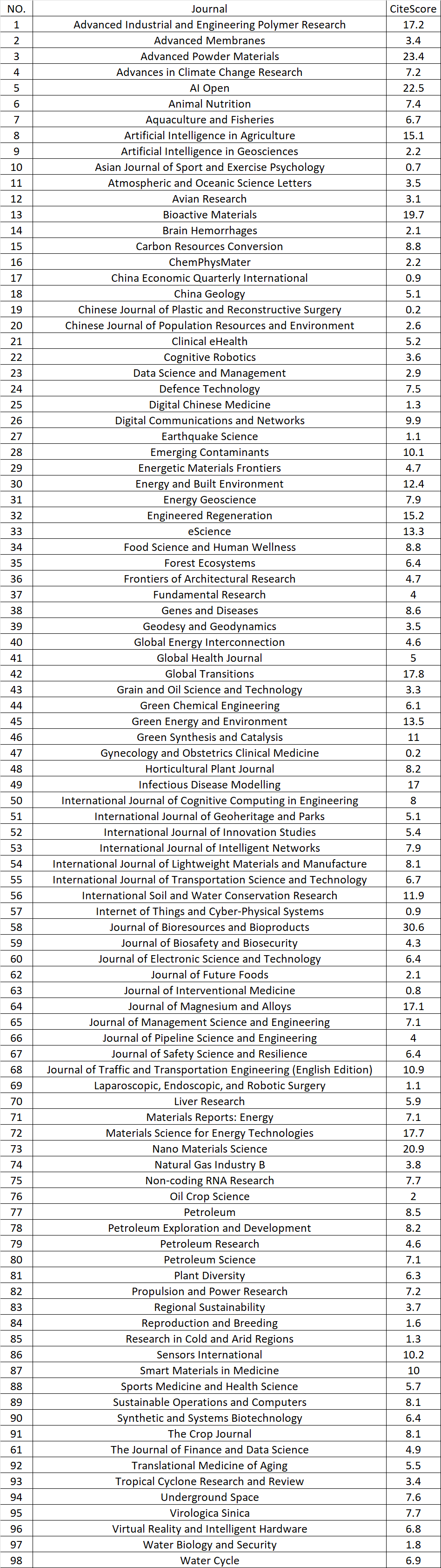 - 98 KeAi journals received CiteScore this year, compared with last year’s 62 journals;