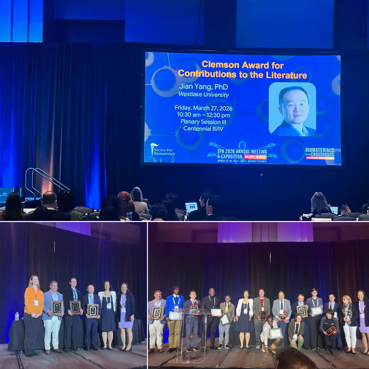 Among them, Prof. Jian Yang, Editor-in-Chief of Bioactive Materials and from Westlake University, was honored with the CLEMSON AWARD FOR CONTRIBUTIONS. He is the third Chinese person to win this award. This award recognizes an individual who has made a significant contribution to the literature on the science or technology of biomaterials.