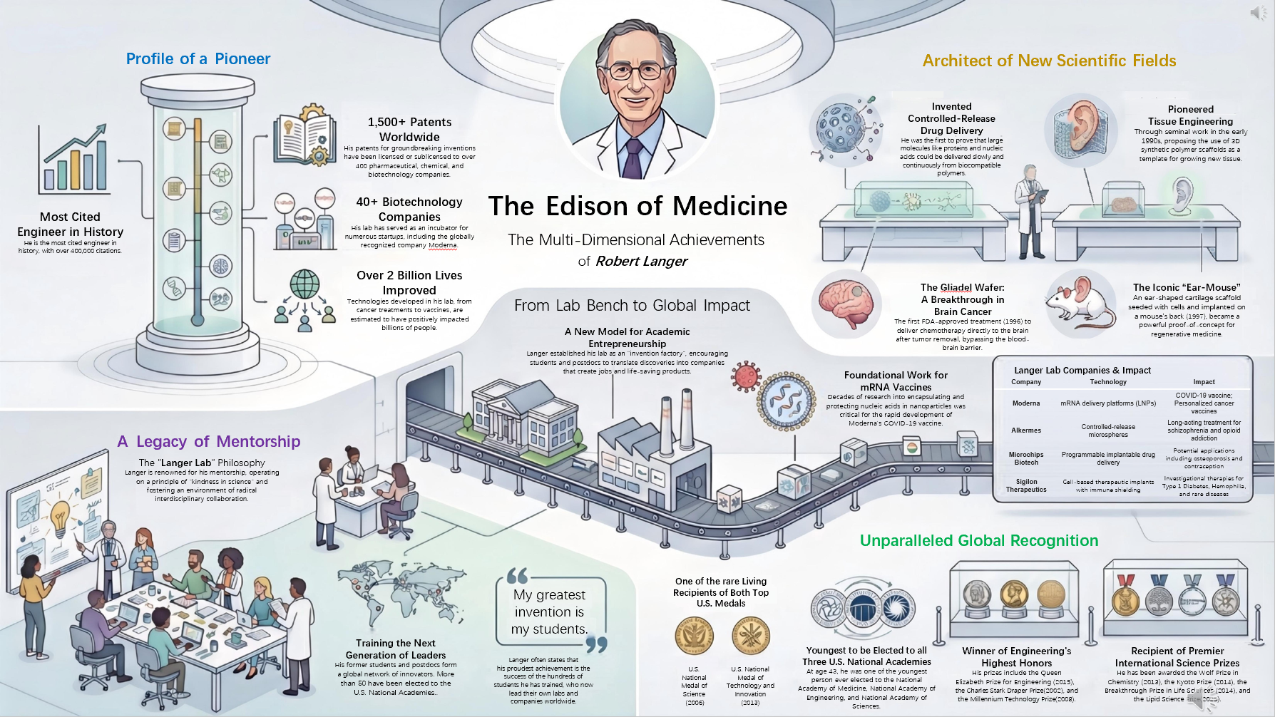 Professor Langer's groundbreaking work has benefited millions around the world. He collaborated with Dr. Judah Folkman to isolate the first angiogenesis inhibitors, leading to new treatments for cancer and blindness. He also developed the first nanoparticles and microparticles for delivering large molecules including nucleic acids and helped establish the field of tissue engineering. This field has enabled the creation of artificial skin for burn victims and advanced organ-on-a-chip technology. His academic journey was not without challenges. He faced rejection for his first nine grant applications and no engineering department was willing to hire him at the beginning. However, he persisted and has since authored more than 1,600 papers that have been cited over 465,000 times. With an h-index of 334, he stands as the most cited engineer in history. His patents have been licensed or sublicensed to more than 400 companies and he has co-founded over 40 ventures, including Moderna. He chaired the FDA's Science Board from 1999 to 2002 and has received more than 220 awards. These include the U.S. National Medal of Science and the National Medal of Technology and Innovation, making him one of only three living individuals to hold both honors. His other accolades feature the Draper Prize often regarded as engineering's Nobel Prize, the Queen Elizabeth II Prize for Engineering, the Albany Medical Center Prize, the Breakthrough Prize in Life Sciences, the Kyoto Prize, the Wolf Prize, the Millennium Technology Prize, the Kavli Prize in Nanoscience and the Double Helix Medal from Cold Spring Harbor Laboratory. He holds 45 honorary doctorates from renowned institutions such as Harvard University, Yale University, Columbia University and the University of Oxford. He has also been elected to the National Academies of Medicine, Engineering and Sciences as well as the National Academy of Inventors.