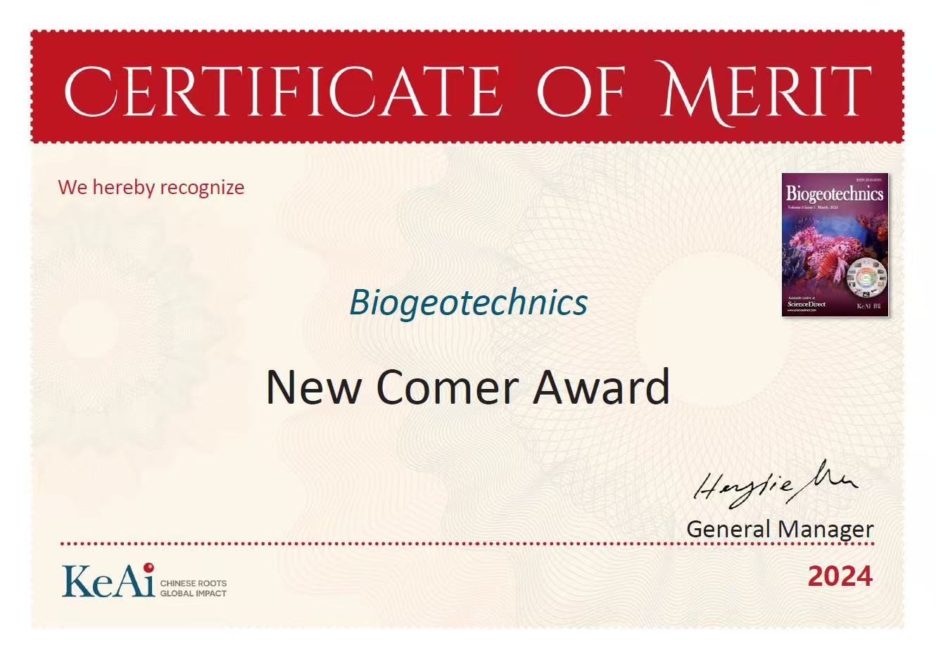 We would like to share that Biogeotechnics is the winner of the 2024 “New Comer Award” as announced by KeAi Publisher on 27 Dec 2024.