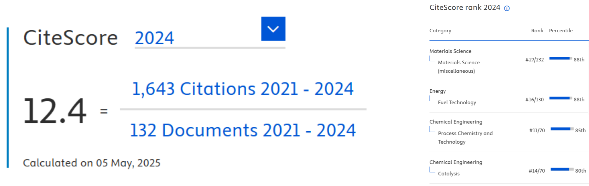 We are delighted to announce the CiteScore 2024* for Carbon Resources Conversion is 12.4, which ranks it 27 out of 232 journals in the Materials Science (miscellaneous) category, 16 out of 130 journals in the Fuel Technology category, 11 out of 70 journals in the Process Chemistry and Technology category and 14 out of 70 journals in the Catalysis category.