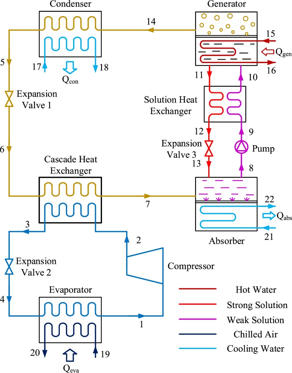The Compression-Absorption Cascade Refrigeration Cycle (CACRC) system, merging Vapor-Compression Refrigeration (VCR) with Absorption Refrigeration Cycle (ARC), presents a promising answer to the pressing energy demands and environmental concerns associated with traditional cooling methods. While the VCR is celebrated for its superior performance and ability to achieve low temperatures at a high energy cost, the ARC, in contrast, operates with minimal electricity, utilizing waste heat. This harmonious combination has generated keen interest in CACRC, recognizing its potential utility in critical areas such as food preservation and district cooling.