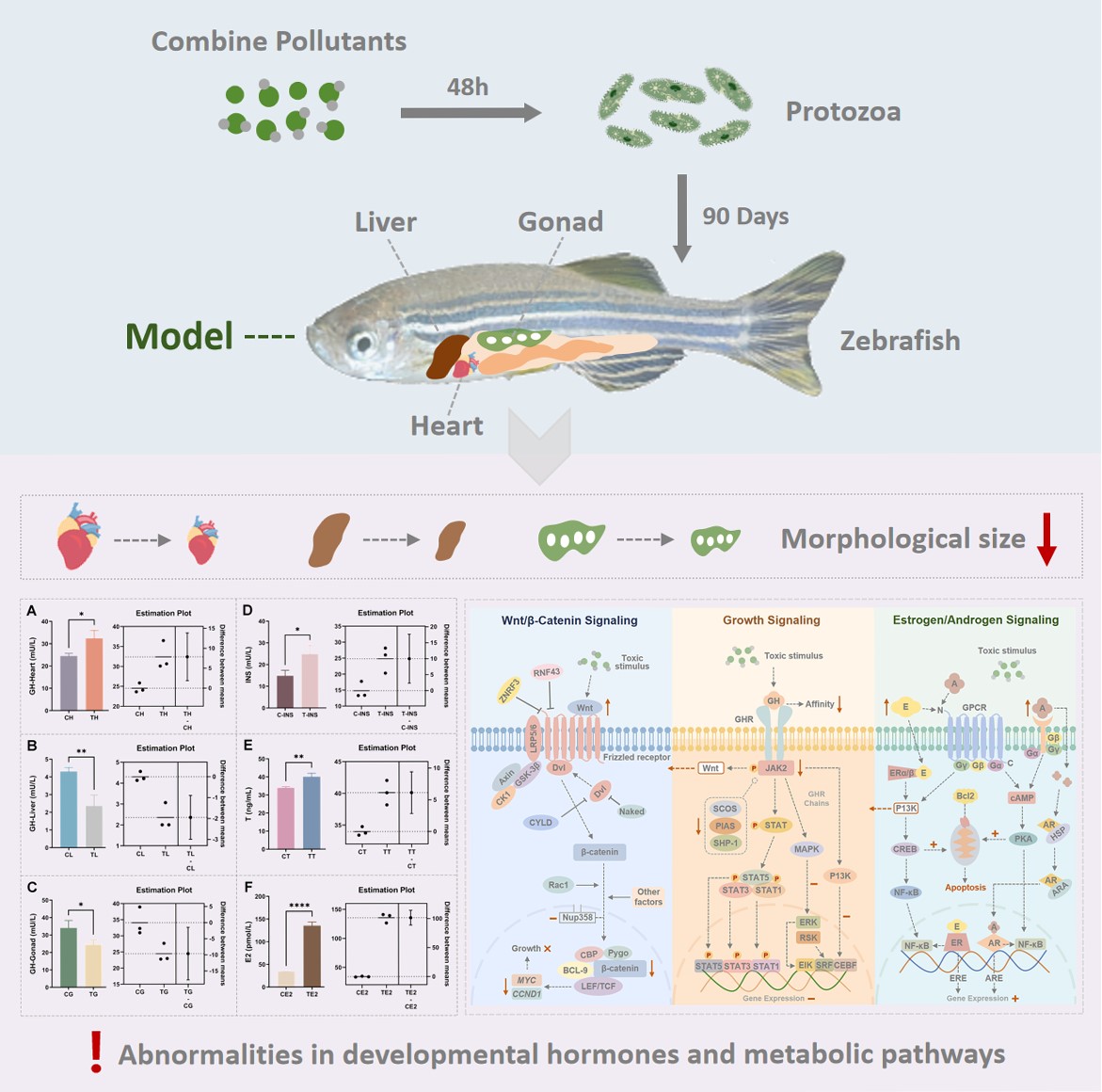 “We used zebrafish as a model to trace how combined pollutants move through aquatic food webs,” shares lead author Yan Zhang. “Over a 90-day experiment, zebrafish exposed to microplastics and cadmium—first absorbed by protozoa—showed delayed growth in the heart, liver and reproductive organs.”