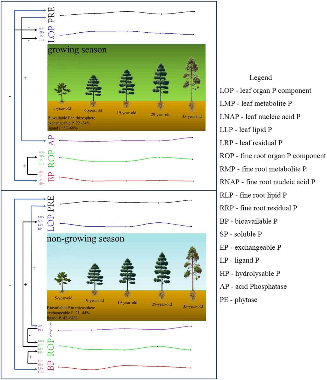 The production of dissolved P by soil phosphatases would somewhat limit the reduction in soil-bioavailable P caused by leaf P resorption. The variations in leaf organ P components between the growing and non-growing seasons are attributed to the allocation of P by the Pinus massoniana.