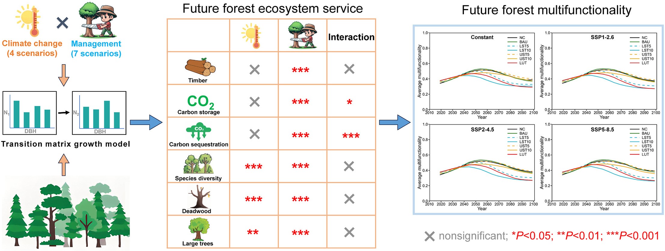 Climate change and forest management are two crucial factors affecting forest multifunctionality. Simulating the effects of different management and climate scenarios on forest ecosystem services is essential for maximizing the multifunctionality of forests.