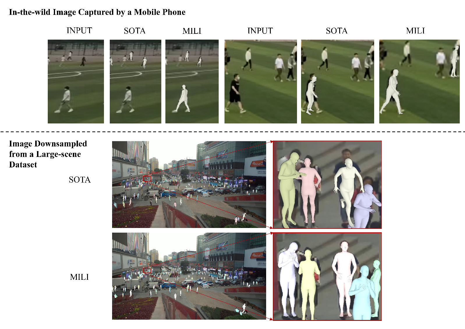 CAPTION: Using a low-resolution image captured by a mobile phone or downsampled from a large-scene dataset, the new method MILI (multi-person inference from a low-resolution image) can achieve more accurate multi-person reconstruction compared with a state-of-the-art (SOTA) method.