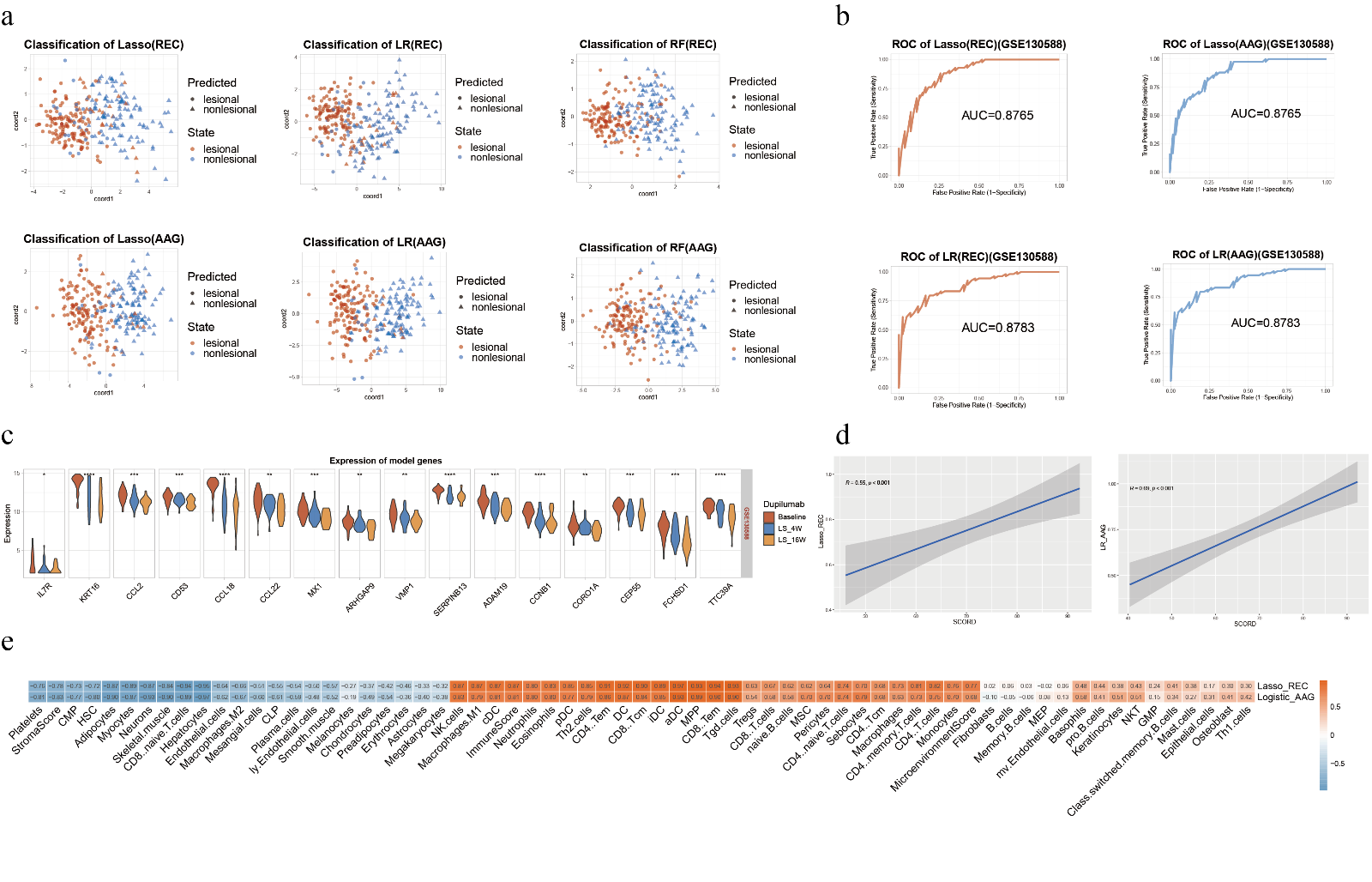 Image: Six models were established using two batches of model genes(REC and AAG), and along with three machine learning algorithms: LASSO, linear regression (LR), and random forest (RF): a. The models can accurately identify AD lesions in training data; b. LASSO (REC and AAG) and LR (REC and AAG) models showed good classification performed in the testing datasets; C. all genes displayed a significant time-dependent downregulation in the LASSO and LR models with Dupilumab treatment; c. all genes displayed a significant time-dependent downregulation in the LASSO and LR models with Dupilumab treatment; d. LASSO(REC) and LR(AAG) model scores were positively correlated with SCORD; e. Correlation between LASSO (REC) and LR (AAG) model scores and immune cell infiltration.