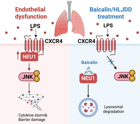 “Previously, we focused on the physiological and pathological functions of NEU1, and screened many natural molecules targeting NEU1, among which baicalin is one,” adds lead author Yu-Je Wu. “We demonstrated that baicalin can significantly improve ALI, and baicalin can bind to NEU1, promoting its degradation via the lysosomal pathway, thereby inhibiting the CXCR4/JNK signaling pathway.”