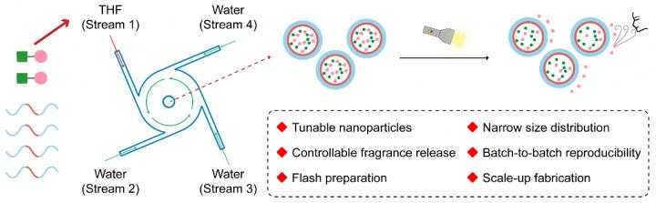 Co-corresponding author Wei-Hong Zhu, from the East China University of Science and Technology, explains: "Compared to conventional thermodynamic self-assembly methods, FNP-mediated profragrance nanoparticles can be tuned by varying experimental parameters. As a result, we were able to obtain profragrance nanoparticles which precisely control fragrance release, both in an aqueous solution and on wallpaper under indoor light. In addition, with this engineering strategy, the flash and scale-up preparation of profragrance nanoparticles can be easily realized for industrial applications, with high batch-to-batch reproducibility."