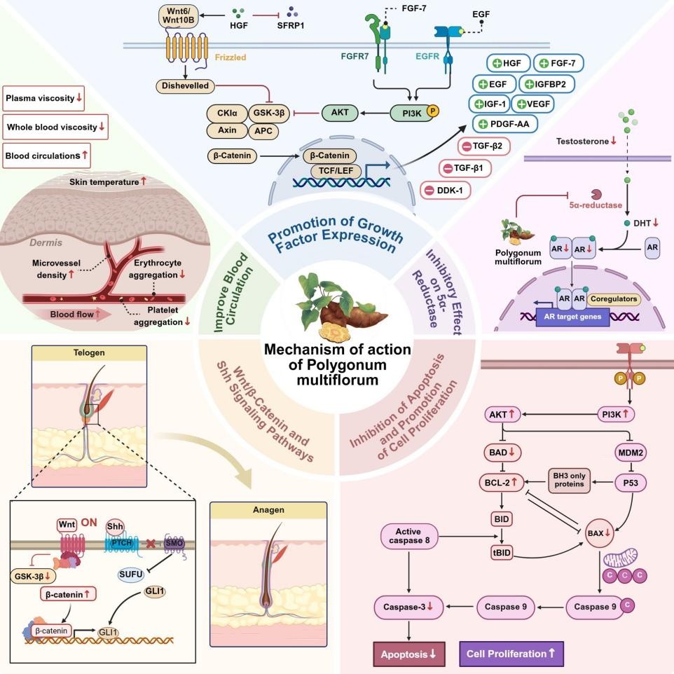 The review synthesizes evidence from lab studies, clinical reports, and centuries-old herbal records. It highlights that Polygonum multiflorum doesn't just slow androgenetic alopecia—it actively promotes regeneration through a network of growth factors and signaling pathways, offering a more comprehensive approach than single-action drugs.