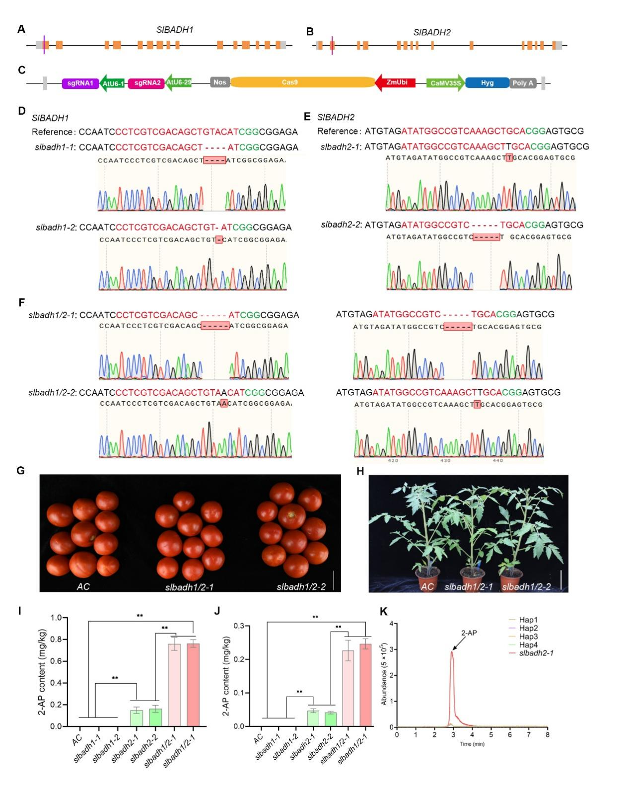 "To identify BADH2 homologs in tomato, we screened the tomato reference genome, two putative SlBADH genes were identified in tomato, defined as SlBADH1 and SlBADH2, respectively," shares corresponding author Shengchun Xu, a professor at Xianghu Laboratory, China. "The CRISPR/Cas9‐mediated genome editing technology was used to knock out individual or both SlBADH1 and SlBADH2 gene in the variety AC (Alisa Craig)."