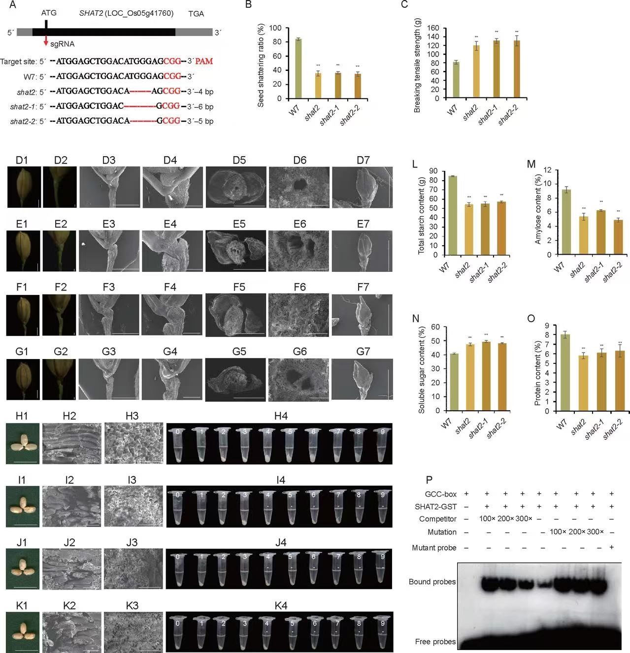 Notably, the shat2 allelic mutants exhibited impacts on seed shattering and grain quality, suggesting the substantial potential of SHAT2 for application in breeding rice varieties with desirable shattering characteristics and superior grain quality.