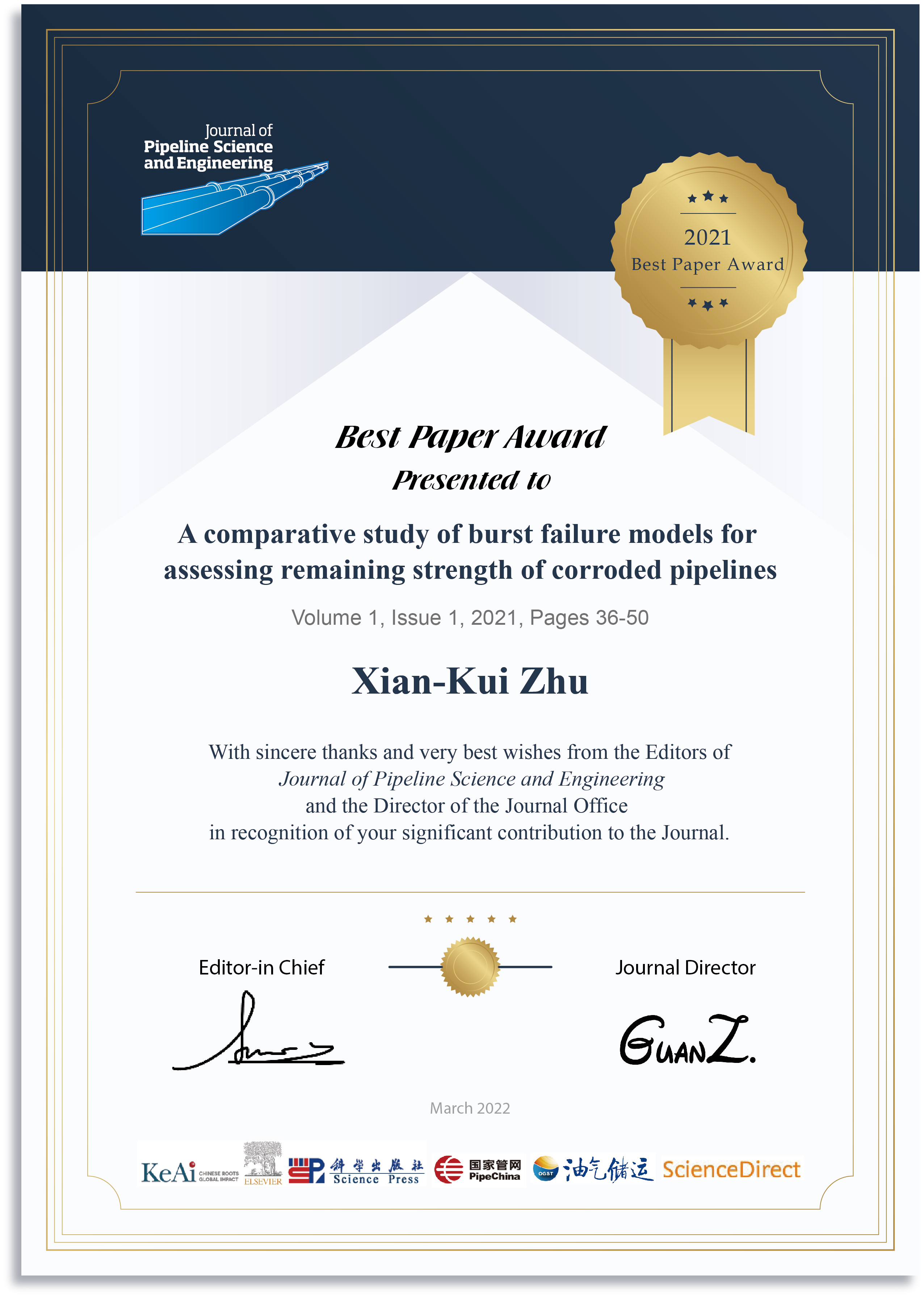 The editorial board of Journal of Pipeline Science and Engineering (JPSE) are pleased to bring you the first best paper award for the journal. Annually, a best paper will be selected by the board and certificate/s will be issued to the authors.