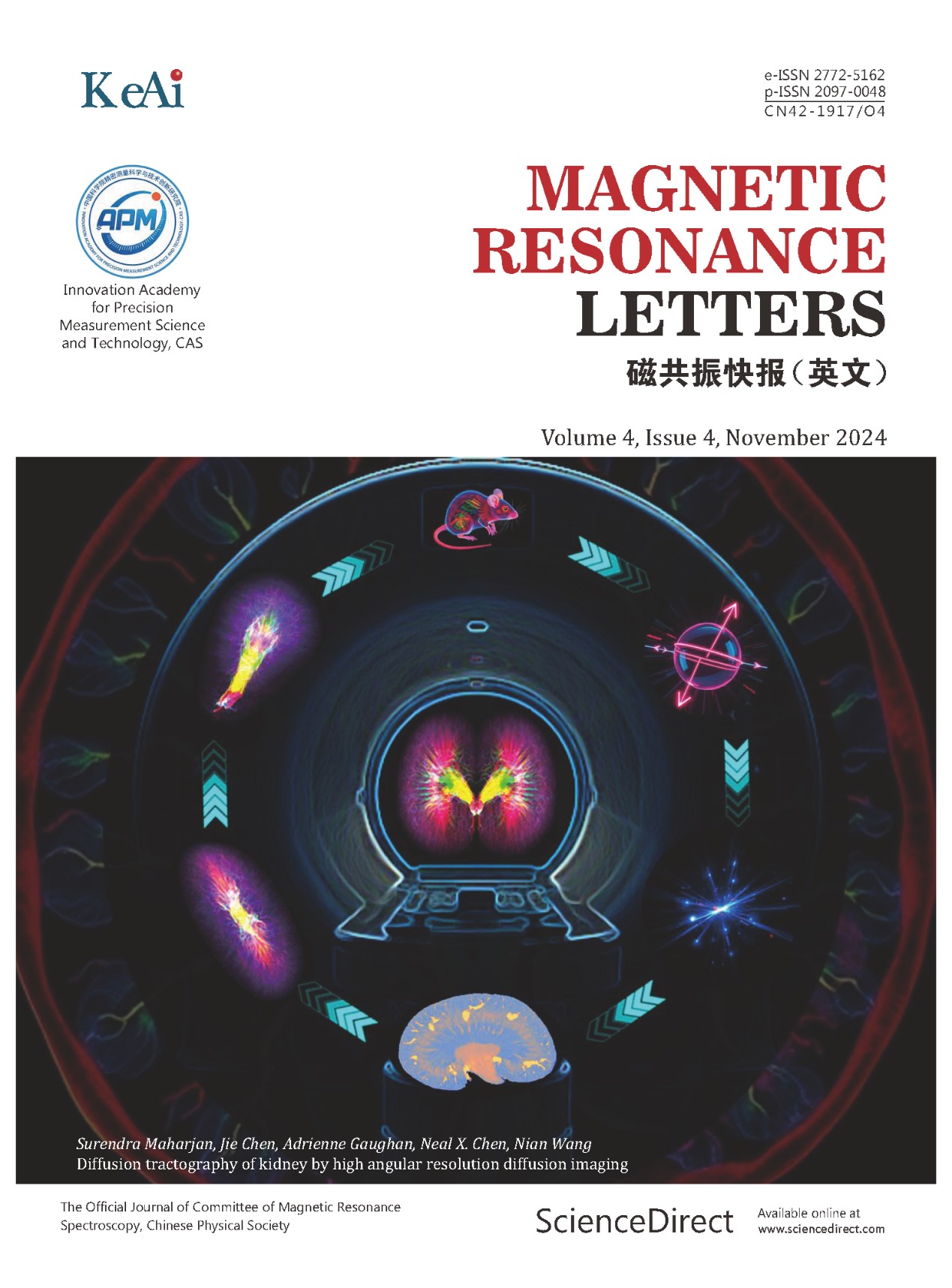 Magnetic Resonance Letters (MRL) is an open access journal that publishes research articles, communications and reviews on all aspects of magnetic resonance. The journal encompasses research on in vivo magnetic resonance imaging (MRI), functional magnetic resonance imaging (fMRI), magnetic resonance spectroscopy (MRS), high-resolution liquid and solid-state nuclear magnetic resonance (NMR), electron spin/paramagnetic resonance (ESR) and nuclear quadrupole resonance (NQR), etc.