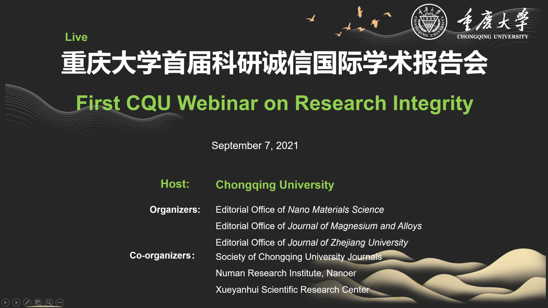 The seminar was chaired by Professor Zhang Yuxin from the School of Materials Science and Engineering at Chongqing University, who is also Executive Deputy Editor-in-chief of the university journal Nano Materials Science. And it was hosted by the editorial departments of Nano Materials Science and Journal of Magnesium and Alloys, and Journal of Zhejiang University. It was co-organised by the Journal Research Association of Universities in Chongqing, nanoer.net, and 51leaning - Research Service Innovation Platform.