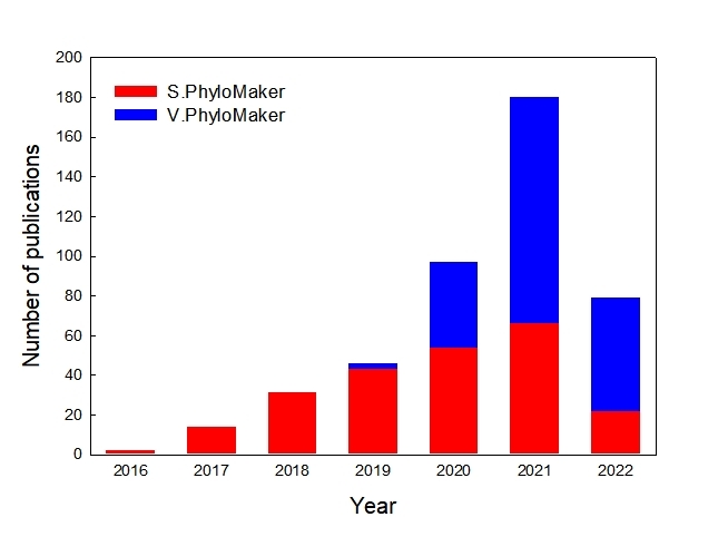 Image: The number of publications that have used either S.PhyloMaker or V.PhyloMaker in each year, based on Clarivate’S ISI Web of Science (accessed on April 21, 2022). CREDIT: Jin and Qian, 2022, Plant Diversity https://doi.org/10.1016/j.pld.2022.05.005