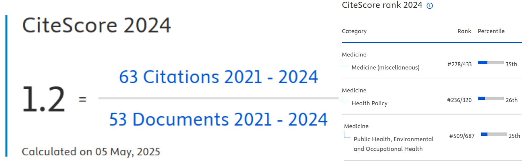 *CiteScore metrics from Scopus are comprehensive, transparent, current, and free metrics for serial titles in Scopus. CiteScore 2024 is based on the number of citations received in 2021-2024 to 5 peer-reviewed document types (articles, reviews, conference papers, data papers, and book chapters) by a journal in the same four years, divided by the number peer-reviewed documents indexed in Scopus and published in those same four years.
