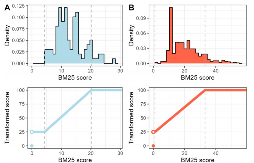 The pipeline ingests articles via the BelgaPress API and computes two relevant dimensions per article: entity relevance (“does the article focus on a specific supervised institution?”) and thematic AML relevance (“is the content AML‑related?”). Both rely on BM25 scoring with calibrated transformations; overall article relevance is the geometric mean of entity and thematic scores.
