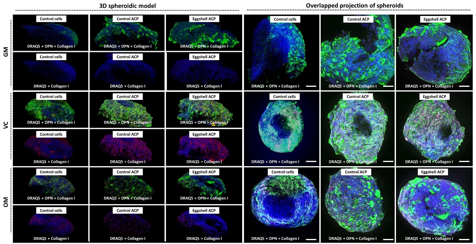 Osteogenic Eggshell acp materials in 3d spheroids: Eggshell acp encourageS osteoblasts to produce A large amount of opn and collagen I for supporting bone formation. credited by Qianli ma.