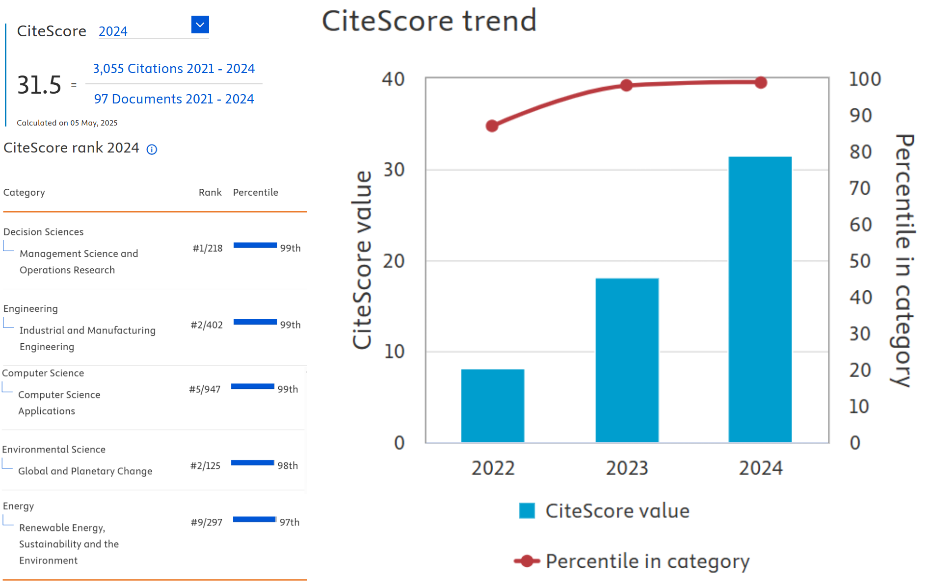We are delighted to announce the CiteScore 2024* for Sustainable Operations and Computers is 31.5, which ranks it 1 out of 208 journals in the Management Science and Operations Research category, 5 out of 947 journals in the Computer Science Applications category, 2 out of 402 journals in the Industrial and Manufacturing Engineering category, 2 out of 125 journals in the Global and Planetary Change category and 9 out of 297 journals in the Renewable Energy, Sustainability and the Environment category.