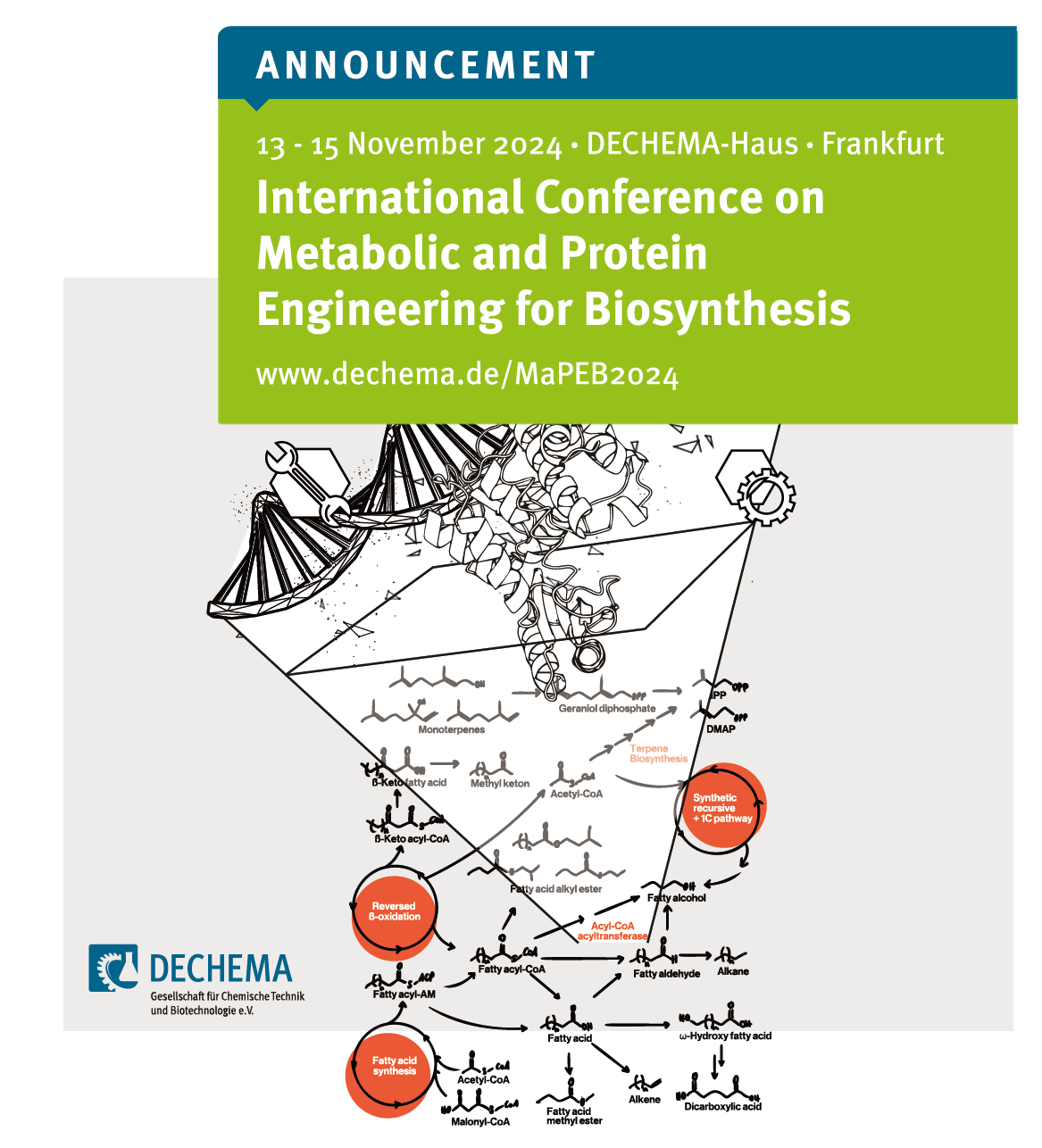 The organizers invite you to the international conference on Metabolic and Protein Engineering for Biosynthesis from 13-15 November 2024 in Frankfurt. The programme covers research advances in metabolic and protein engineering that is focused on the remodeling or de novo design of biosynthetic pathways and metabolic networks. Topics include remodeling and engineering of primary and secondary metabolism, de novo design of new biosynthetic pathways, protein engineering for pathway design and protein engineering methods.