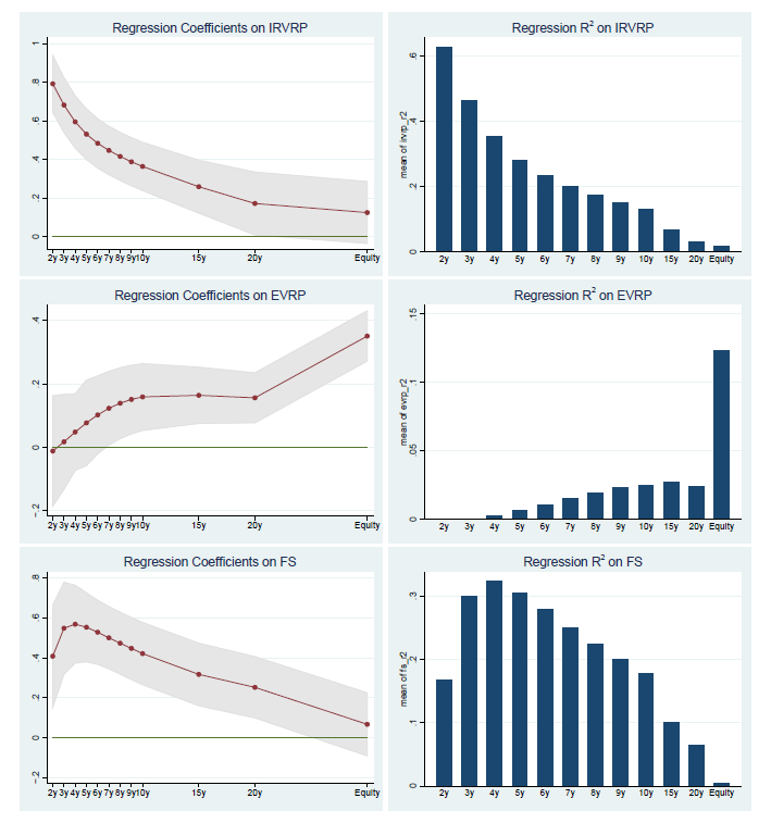 “EVRP is a measure similar to IRVRP that reflects compensation for exposure to volatility in the aggregate equity market,” explained Grishchenko. “Similar to the case in IRVRP, forward spread (FS), a difference between longer- and shorter-term interest rates, is a classical predictor of U.S. Treasury securities excess returns’ it explains the variation in them for relatively longer maturities. As such, it is likely to be associated with long-run risks.” This result is reflected in the bottom-row charts of Figure 2.
