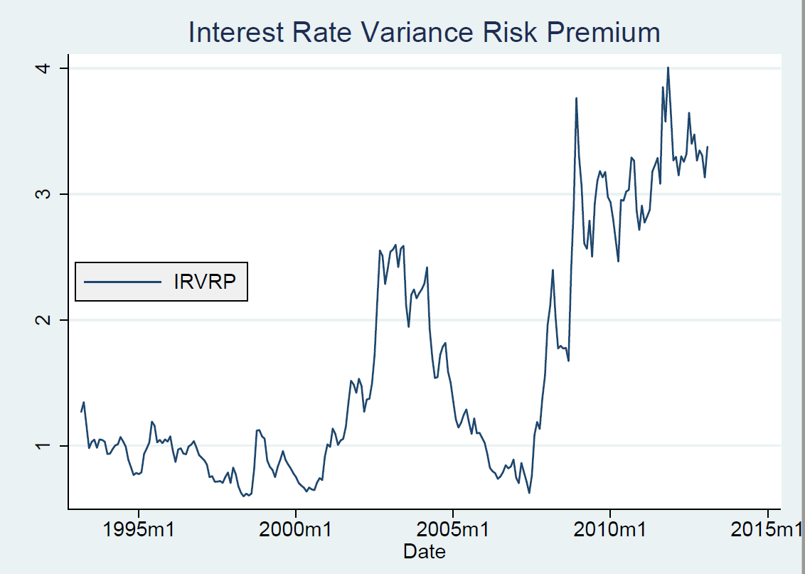 The researchers measured the implied variance using options on U.S. interest rate swaps, or swaptions. They also measured realized variance of the U.S. Treasury securities, that is, U.S. government bonds, as a sophisticated average of their past squared returns. The IRVRP is shown in Figure 1.