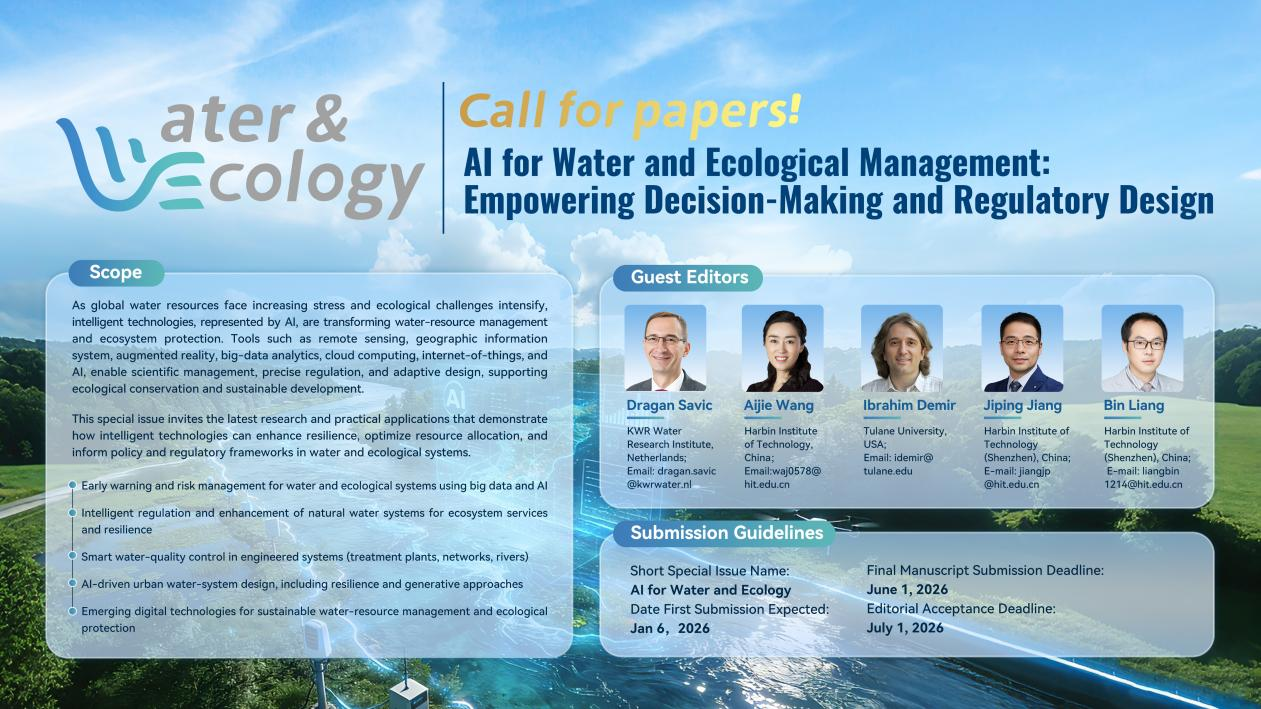As global water resources face increasing stress and ecological challenges intensify, intelligent technologies, represented by AI, are transforming water-resource management and ecosystem protection. Tools such as remote sensing, geographic information system, augmented reality, big-data analytics, cloud computing, internet-of-things, and AI, enable scientific management, precise regulation, and adaptive design, supporting ecological conservation and sustainable development. To showcase the latest developments, promote academic exchange and technology dissemination, and advance the innovation and application of intelligent technologies in water and ecology, Water & Ecology is launching a special issue on "AI for Water and Ecological Management: Empowering Decision-Making and Regulatory Design". This special issue is launched by Professor Dragan Savic (a member of the Editorial Board of Water & Ecology), Professor Aijie Wang (Harbin Institute of Technology), Professor Ibrahim Demir (Tulane University), Professor Jiping Jiang, and Professor Bin Liang (both from Harbin Institute of Technology, Shenzhen).
