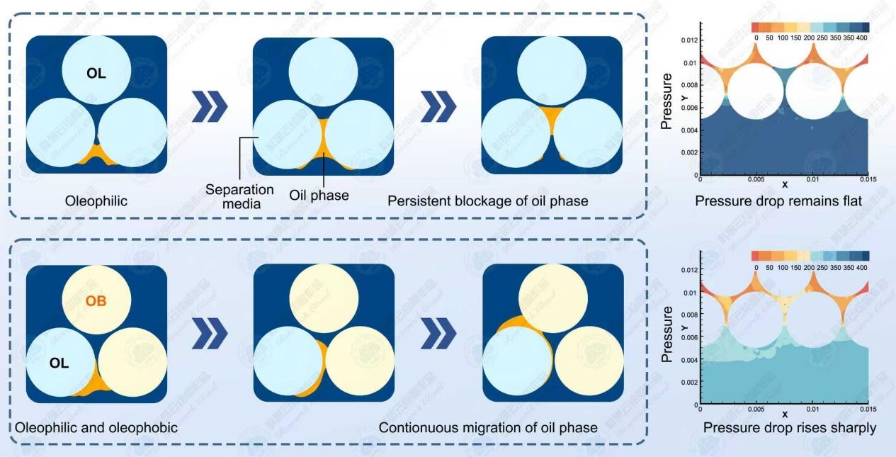 “The wettability gradient between the OL and OB surfaces also induces a wetting force that drives the oil phase to migrate from the OB surface to the OL surface, promoting effective coalescence,” adds Lv. “Therefore, the combined use of OL and OB can achieve synergistic effects: the high oil affinity of OL enhances wetting and coalescence efficiency, while the high water affinity of OB promotes water film formation, which not only improves water flux but also reduces bed pressure drop.”