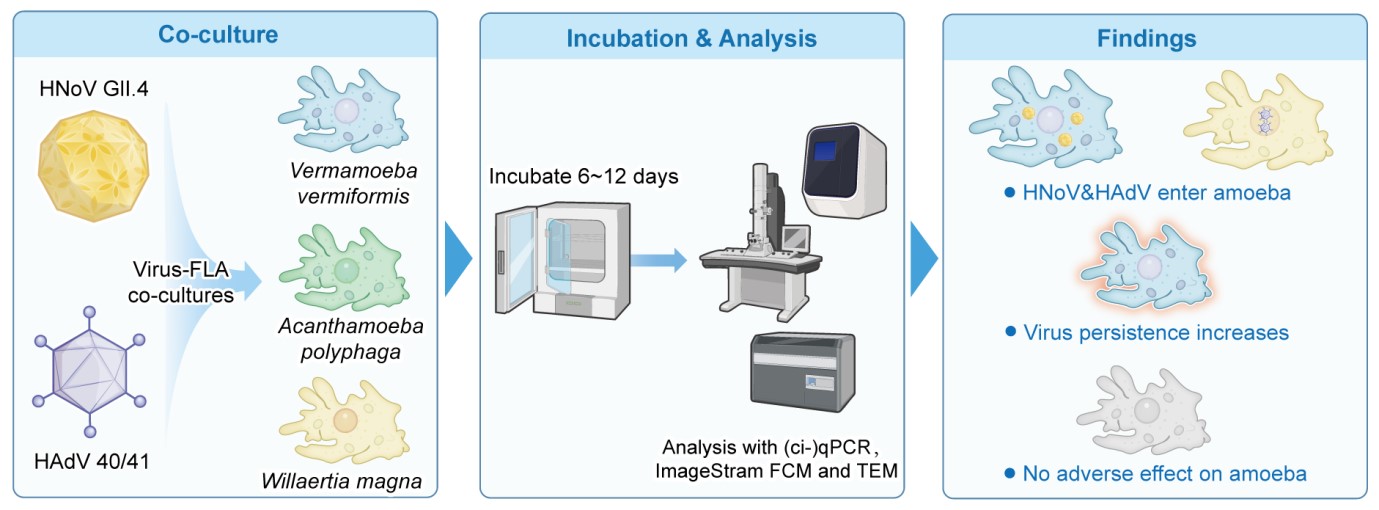 A new study published in Water & Ecology reveals that common waterborne amoebae can ingest and protect human viruses, extending their environmental persistence. Human norovirus (HNoV) and human adenovirus (HAdV)—major causes of acute viral gastroenteritis worldwide—are transmitted through contaminated water and food. The study shows these viruses can enter and persist within FLA, including Vermamoeba vermiformis, Acanthamoeba polyphaga, and Willaertia magna.