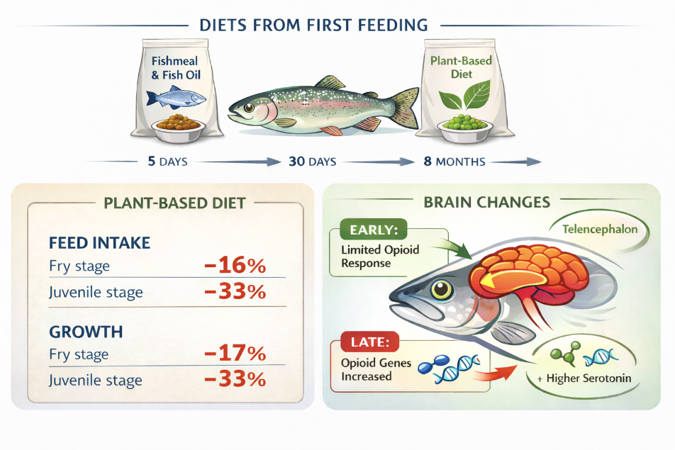As aquaculture shifts toward fish-free feeds to reduce reliance on fishmeal and fish oil, producers face a recurring problem: some fish eat less and grow more slowly on fully plant-based diets. A new study in rainbow trout shows that this drop in performance is accompanied by delayed, time-dependent changes in the brain’s opioid system — a key pathway involved in food reward and palatability.