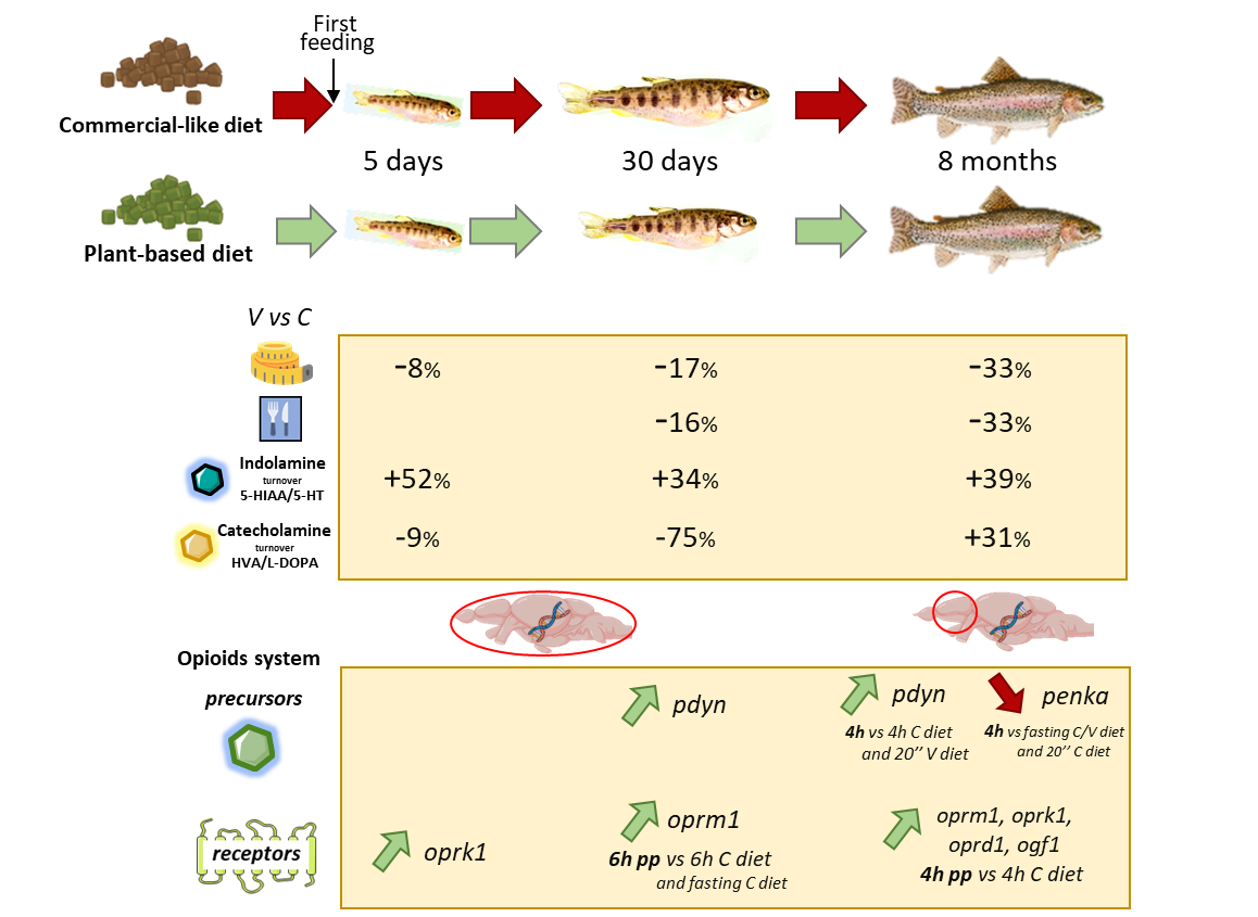 The team also measured indicators of neurotransmitter activity and the expression of opioid-related genes involved in hedonic regulation. Early on, the opioid response was limited: after 5 days, only one opioid receptor gene (oprk1) showed a diet-related change shortly after a meal. By 30 days, the plant-based group showed a clear shift, including higher serotonin turnover and changes in an opioid precursor gene (pdyn). After 8 months, multiple opioid-system genes in the telencephalon, a brain region associated with reward processing, were affected in fish fed the plant-based diet.