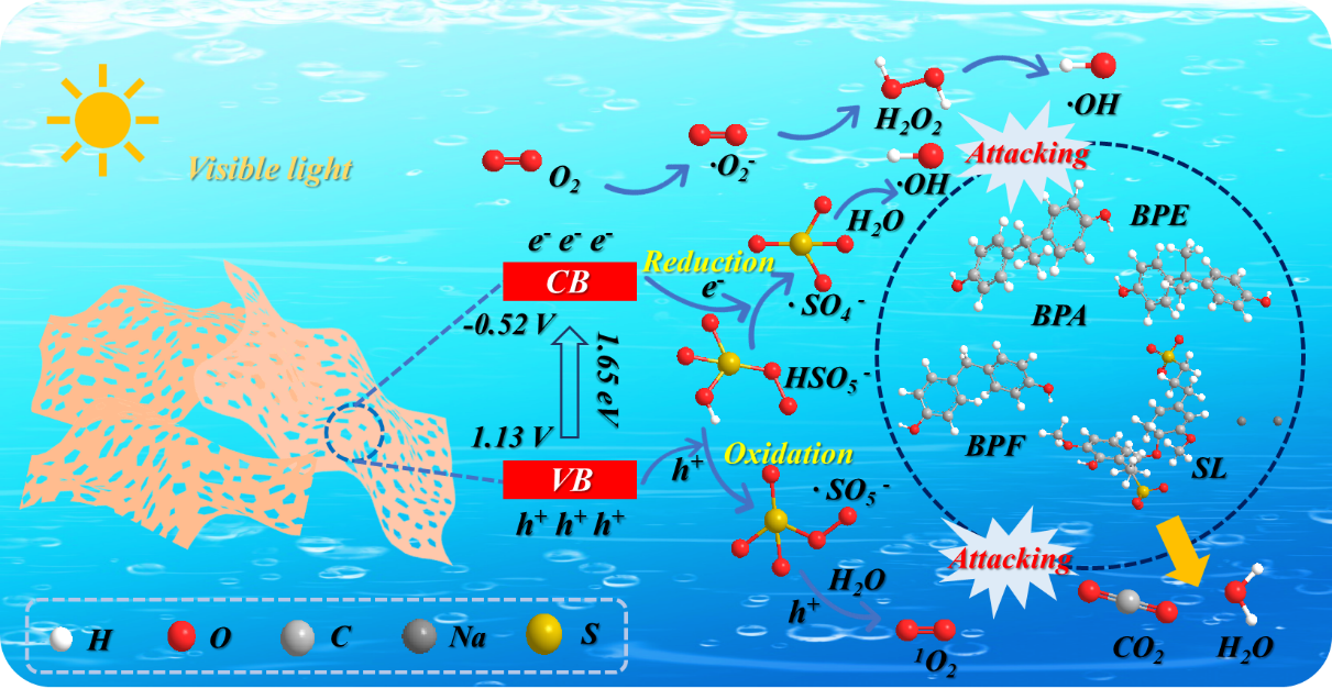 See the article: Liquan Jing etc. Advanced oxidation via the synergy of C-defective/ C–O band modified ultrathin porous g-C3N4 and PMS for efficient photothermal degradation of bisphenol pollutants and lignin derivatives. Green Energy & Environment (2023).