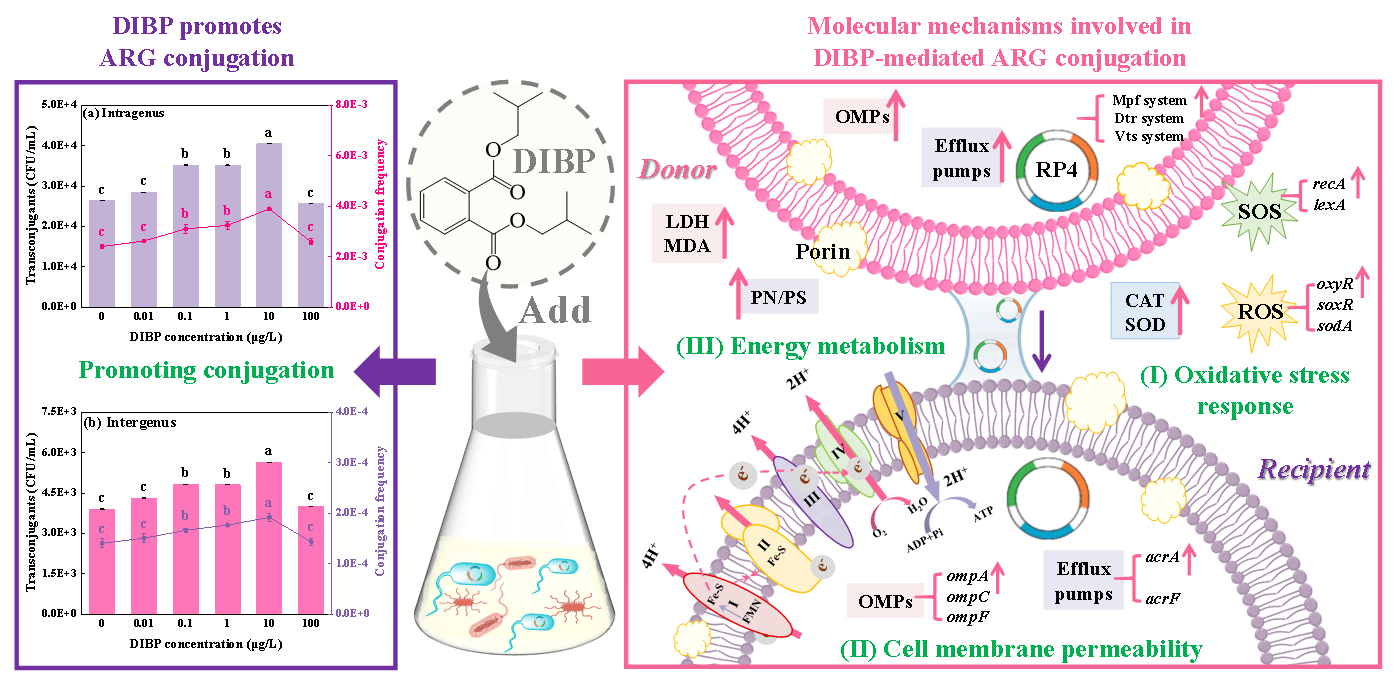 The team found that DIBP at environmentally relevant concentrations (0–100 μg/L) significantly increased conjugative transfer frequency in both intragenus (E. coli DH5α to E. coli HB101) and intergenus (E. coli DH5α to B. subtilis WB100N) systems. Mechanically, DIBP-induced oxidative stress serves as the primary upstream trigger, activating relevant stress-response signaling pathways (such as SOS response) that upregulate conjugation-associated gene while concurrently causing cellular damage.