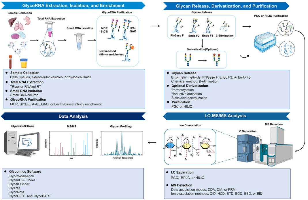 The authors took into account the unique biochemical characteristics of RNA. An aspect highlighted was the systematic overview of glycoRNA enrichment strategies, including metabolic labeling approaches (Ac4GalNAz) and chemoenzymatic labeling methods (StCEL and rPAL), which enable the selective capture and enrichment of glycoRNA from complex biological samples. Furthermore, the authors discussed the integration of LC-MS/MS analysis with multiple ion dissociation techniques, such as CID, HCD, and ETD, together with bioinformatics tools for glycan identification and structural analysis, including GlycoNote and GlycanDIA Finder.