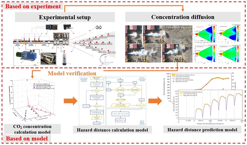 The team first carried out four sets of full-size burst tests with different initial conditions to clarify the effect of initial conditions on the CO2 concentration in the near and far field of leakage. The researchers then verified the CO2 concentration diffusion model through the measured concentration data, on the basis of which the CO2 hazard distance calculation model was proposed.
