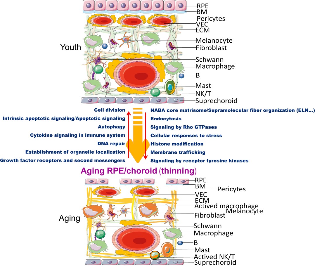The RPE and choroid, located behind the human retina, are fundamental to vision, playing a myriad of roles from light absorption to providing oxygenated blood to the photoreceptor cells. However, our understanding of the gene expressions within these cells and how they contribute to retinal diseases has been limited. Over time, the human RPE accumulates lipofuscin, an end product of phagosome breakdown, which weakens the RPE cells. Concurrently, the choroidal thickness decreases dramatically with age, reducing its blood flow. Both factors contribute to age-related macular degeneration (AMD), a condition that affects millions of people worldwide.