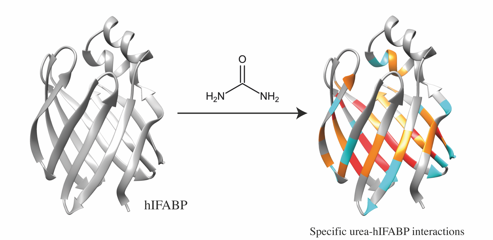 To understand how urea exerts its denaturing effects, researchers first identified water molecules important for stability that were tightly bound to hIFABP. At low concentrations, they found urea could not disrupt these robust interactions. Furthermore, no firm binding of urea directly to hIFABP was observed.