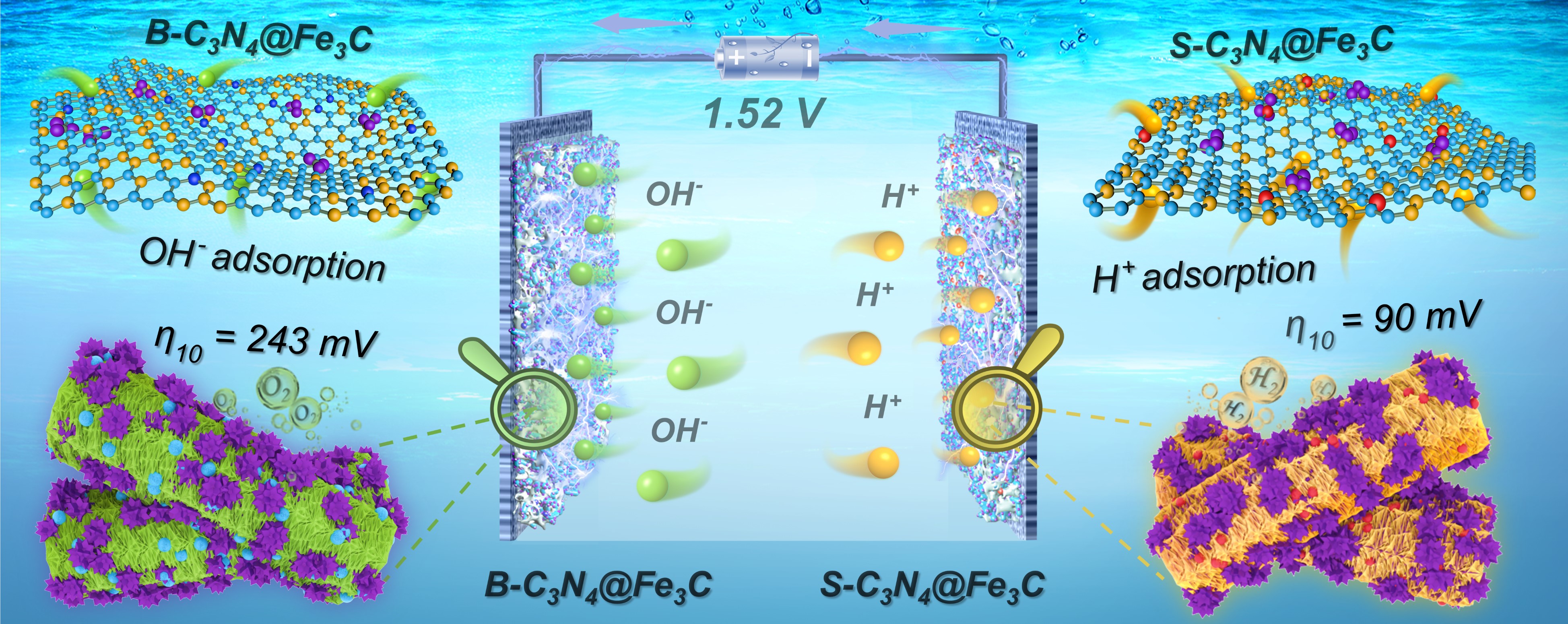 The results revealed that the coupling of Fe3C and g-C3N4optimizes the energy level of g-C3N4 and changes the interfacial charge distribution of g-C3N4@Fe3C, thus enriching OH- and H+ at the solid-liquid reaction interface. Notably, B-C3N4@Fe3C and S-C3N4@Fe3C catalysts exhibited stable HER activity and high selectivity for the OER under alkaline medium.
