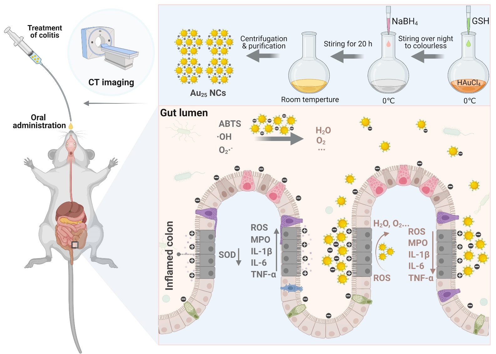 Image: Synthesis of Au25 nanoclusters and the treatment process for colitis in mice. CREDIT: FEI WANG