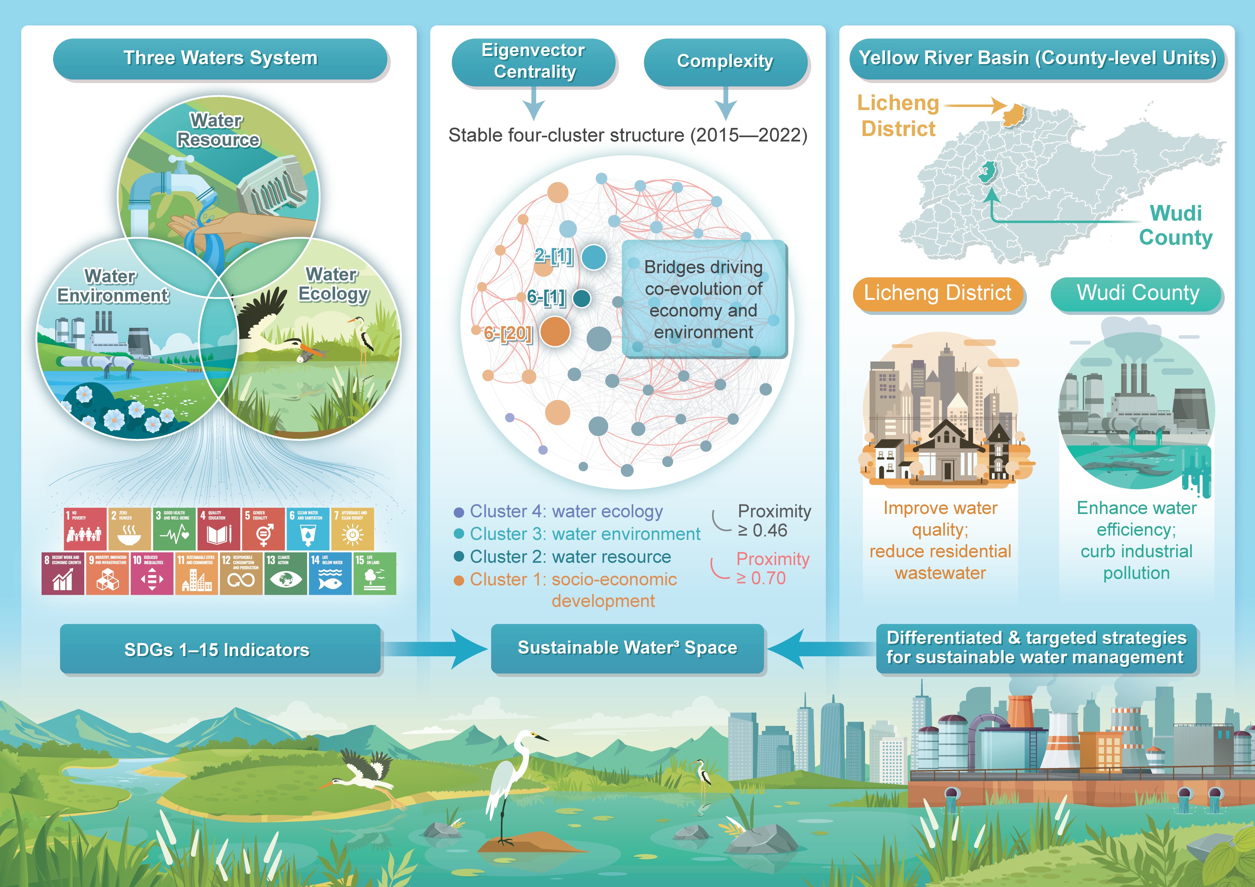 In a new study published in Water & Ecology, a research team led by Mimi Gong from Beijing Normal University and Qiang Huang from Beijing Institute of Technology uncovered interactions within and between the "Three Waters" system and sustainable development goals. Based on the information, the researchers identified key policy levers that support water sustainability in the Yellow River Basin and developed a "Sustainable Water3 Space" network—integrating 53 SDG indicators, combining eigenvector centrality and complexity analyses to identify synergistic relationships and critical "bridge" indicators.